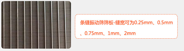 條縫振動(dòng)篩篩板用不銹鋼作篩條制成,有穿條式、焊接式和編織式三種結(jié)構(gòu)型式。條縫振動(dòng)篩篩板的篩條斷面形狀為圓形,縫寬可為0.25mm、0.5mm、0.75mm、1mm、2mm等。條縫振動(dòng)篩篩板適用于對(duì)中細(xì)粒級(jí)的脫水、脫介和脫泥作業(yè)。